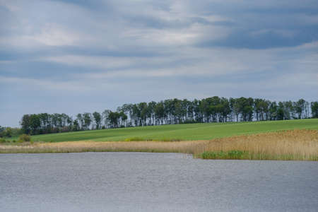 Beautifil view on Kaszuby lake district. Lake surrounded by trees and fields on a sunny, summer day.