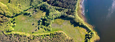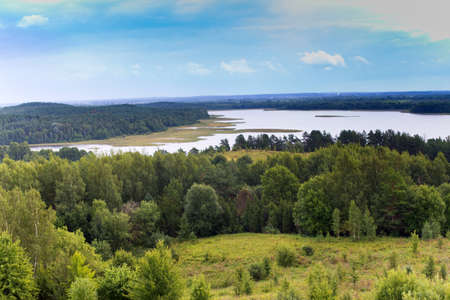 Lake among green trees in the countryside. Aerial view of a large lake or river against a blue sky. Ecology and wetlands concept