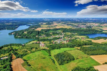 Aerial view of Wdzydze Landscape Park. Kashubian Landscape Park. Kaszuby. Wdzydze Kiszewskie. Poland. Bird eye view.