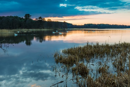 Beautiful lake after sunset with sky reflected in water. Polish lake landscape photographed in Mazury lake district. Place where swans sleeping.
