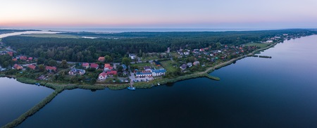 Aerial view of lake and small village on the peninsula. Sunset evening light by calm water on warm beautiful summer day. nature background.