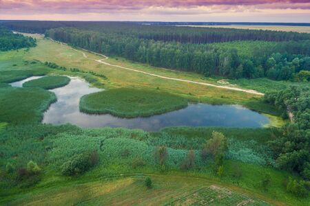 Forest with a winding river at sunset. Aerial photography with a drone.