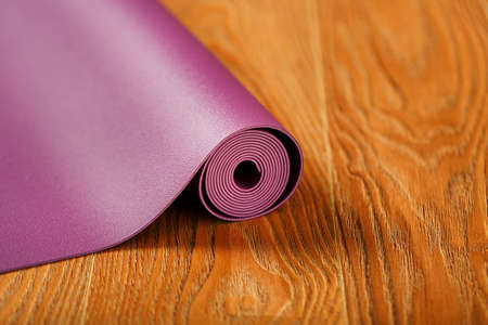 A lilac yoga mat is twisted on the wooden floor. Healthy lifestyle, sports