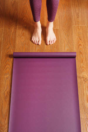 A woman lays out a lilac yoga mat on the wooden floor. Women practicing yoga. A healthy lifestyle in isolation.