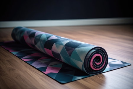 A close-up shot of a rolled yoga mat showcases vibrant colors and highlights the essence of fitness, relaxation, and meditation for wellness-focused individuals.