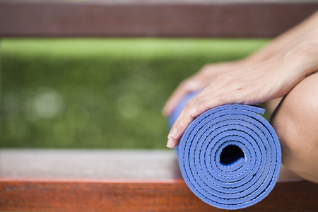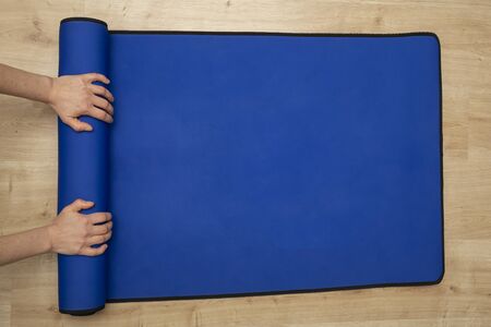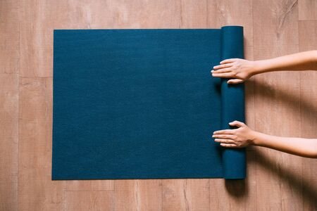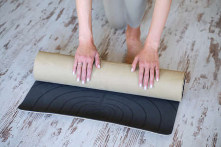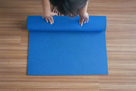 Exercise equipment,Woman hand rolling or folding yoga mat after a workout,Healthy fitness and sport concept,Copy space for text