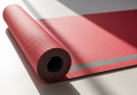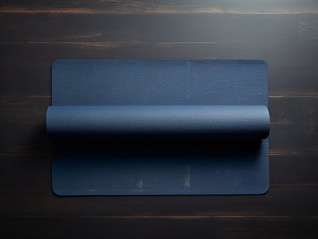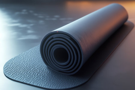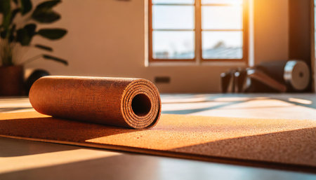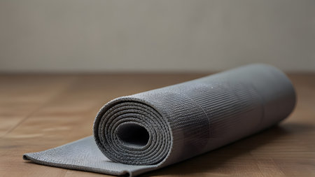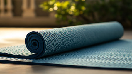 A rolled yoga mat placed on a smooth surface, creating a serene environment perfect for practice.