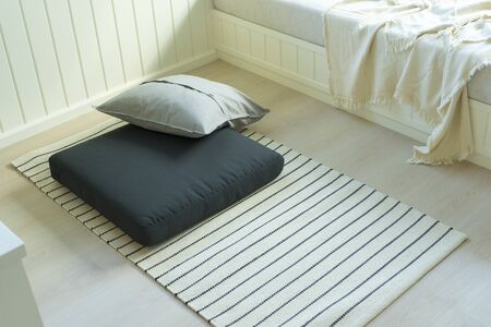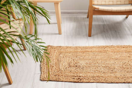 Wicker rug on light wooden floor in room interior
