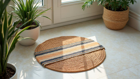 Cozy home welcome mat on sunlit tiled entrance with potted plants. That the image is generated using AI.