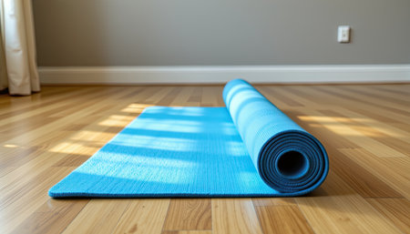A bright blue yoga mat is neatly rolled up on a polished wooden floor within a spacious interior. Sunlight filters through, creating a serene ambiance perfect for wellness and relaxation.