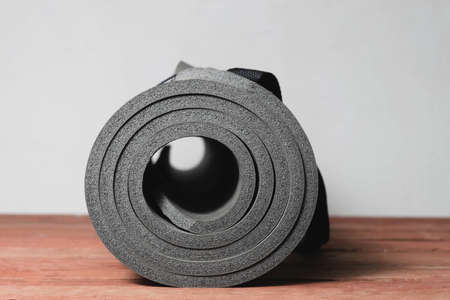 Rolled up yoga mat on wooden floor. Yoga studio equipment.