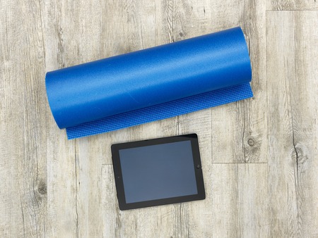 Top view of tablet, headphones, yoga mat and towels before workout. Yoga or fitness concept