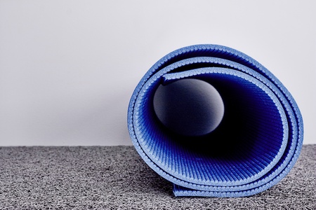 Rolled up blue yoga mat with beige background