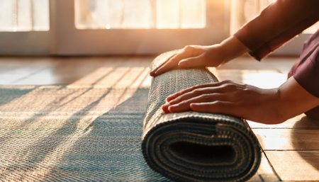 A womans hands are preparing a mat for yoga or meditation.