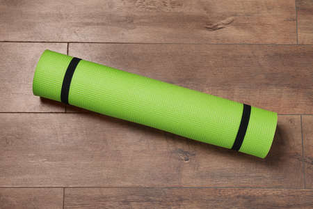 Rolled mat for yoga, pilates or fitness on wood background. Top view