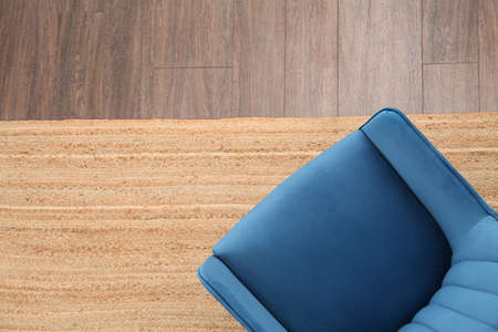 Stylish blue armchair on floor, top view. Space for text