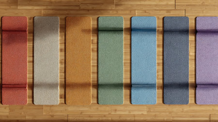 Brightly colored yoga mats are neatly arranged on a natural wooden floor, providing an inviting atmosphere for fitness, wellness, and relaxation activities.