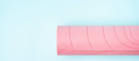 Sports background with pink rolled sports Mat, yoga on blue background with space for text.
