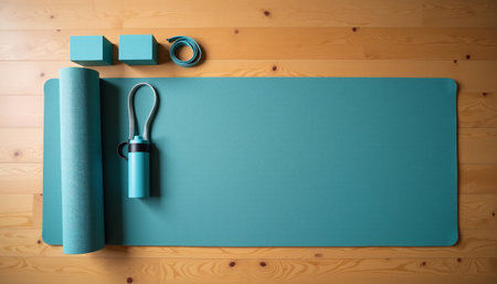 Yoga mat and fitness accessories on wooden background, 3d render