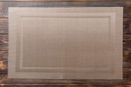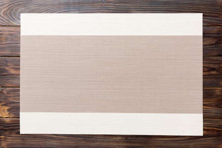 Top view of gray tablecloth for food on wooden background. Empty space for your design.