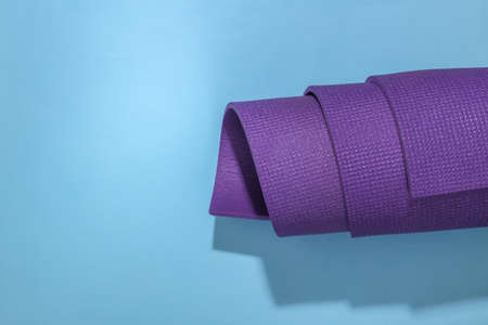 Rolled yoga mat on a bright blue background. Healthy lifestyle concept. top view