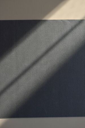 A minimalistic yoga mat rests diagonally on a light surface, showcasing muted tones and clean design, creating a serene atmosphere for mindfulness.