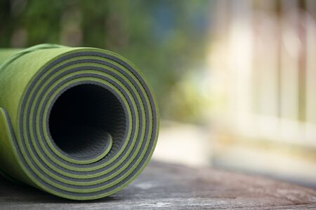 close up of green yoga mat on the table, sport and healthy concept