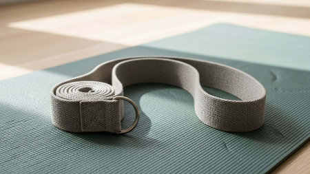 Close-up of a gray yoga belt on a yoga mat.