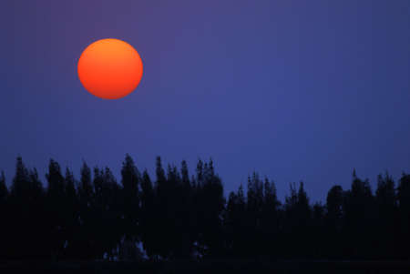 red sun on a dark blue sky above a row of silhouetted trees.