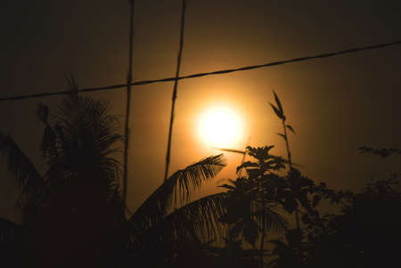 Bright sun in orange sky during hot summer weather.