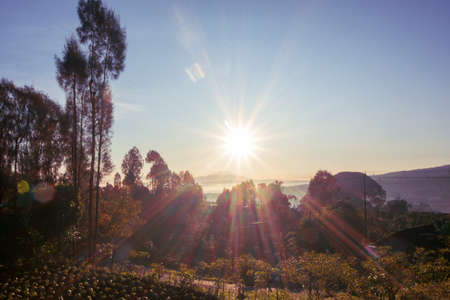 Sunset in mountains,Tree silhouette with scenic sunset sun over colorful sky background.