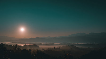 A captivating sunrise casts a warm glow over a mist-laden valley, with silhouettes of mountains stretching across the tranquil landscape, evoking a sense of peace.