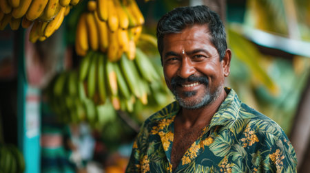 a man holding up a mango with his hands on it, in the style of joyful