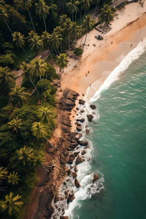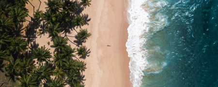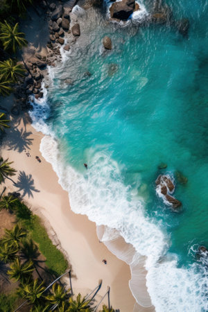Generative AI : Beautiful white sandy beach with turquoise ocean water waves and green fluffy palm trees Aerial top view copy space