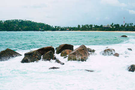 Parrot Rock with waves on sandy beach. Mirissa, Sri Lanka