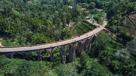 Exploring beautiful landmark called Nine Arch Bridge railway construction. Amazing view in Demodara at a viaduct bridge near small town Ella, Sri Lanka.