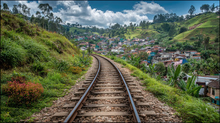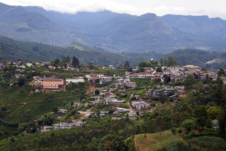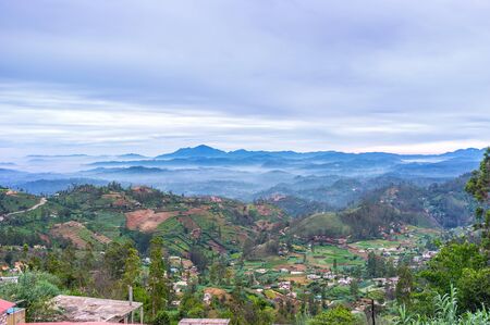 Village against tea plantation in clouds. Agriculture landscape in Sri Lanka.