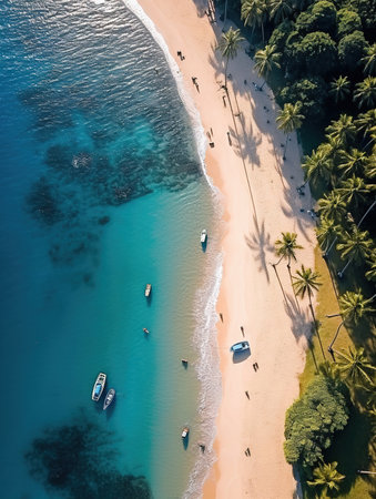 Aerial view of beautiful sandy beach with palm trees and turquoise sea water. Summer vacation and travel concept
