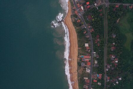 natural aerial drone bird view day shot of the sea shore with a road, beautiful villas, green trees, yellow sand, turquoise blue water, big waves and foam crashing on the beach. Pitiwella, Sri Lanka
