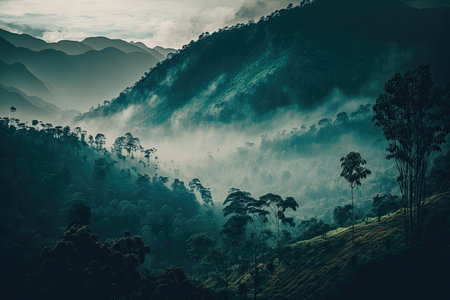 Explore a breathtaking mountain valley scene showcasing mist-covered hills and lush greenery at dawn, evoking tranquility and natural beauty.