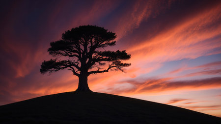 Dramatic sunset sky providing a vibrant backdrop for the silhouette of a lone tree standing on a hilltop