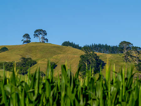 Papamoa Hills beyond cornfields and rolling farmlands.