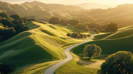 Scenic countryside view of lush green hills, winding roads, and scattered houses, illuminated by warm sunset light