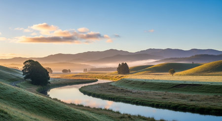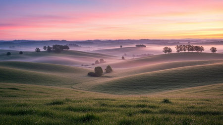 A panoramic view of rolling green hills shrouded in a soft, ethereal mist at sunrise. The gentle slopes are covered in lush grass, with scattered trees dotting the landscape. The rising sun casts a warm, golden light, illuminating the mist and creating a serene and tranquil atmosphere. The scene evokes a sense of peace and natural beauty, with layers of hills fading into the distant horizon.