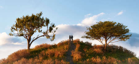 Giant tree in the green grass field. A couple hiking in a fresh nature.