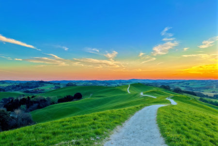 Experience the tranquility of rolling green hills bathed in the warm glow of sunset. A charming dirt road beckons through pastures, inviting exploration under a dramatic sky filled with light.