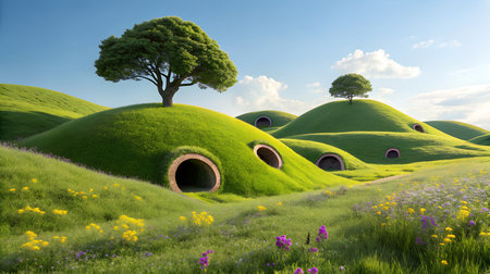 A charming home with a green roof and a red door, showcasing unique and eye-catching architectural elements, A hobbit style house built into the side of a grassy knoll, AI Generated