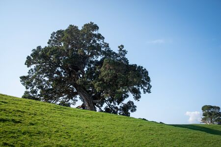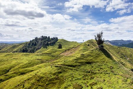 Green hills and blue sky near on the Wharariki beach in National Park. Nelson, South Island, New Zealand.