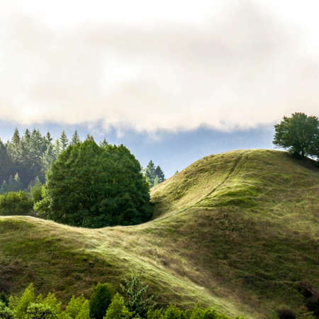 This captivating image features a gentle green hill adorned with isolated trees under a soft gray sky, evoking tranquility and the peacefulness of nature.