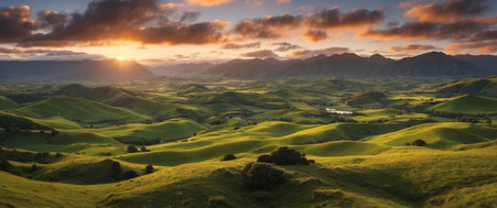 Gentle green hills illuminated by warm golden sunlight, creating dramatic shadows across the lush, vibrant landscape.